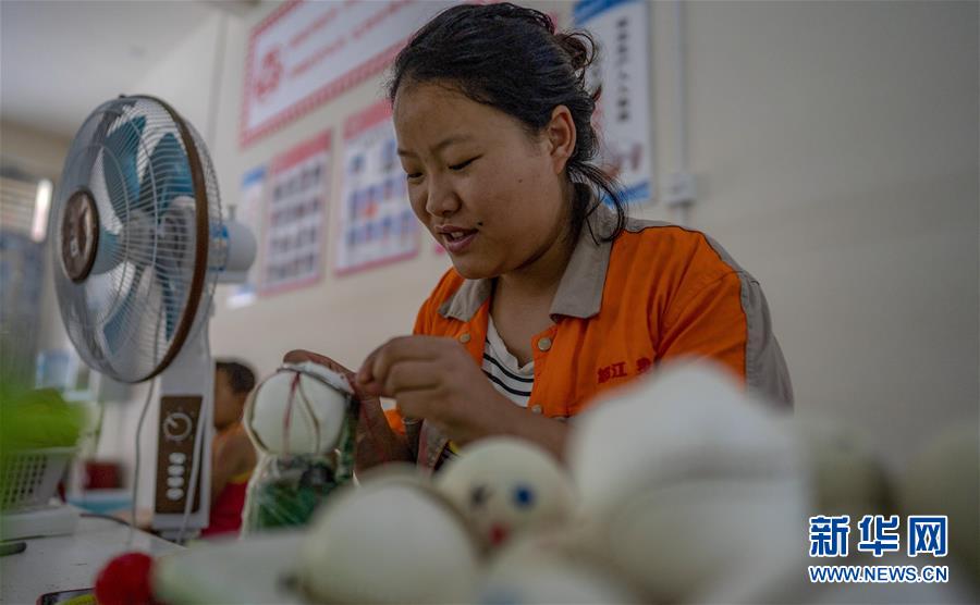 怒江傈僳族自治州福贡县托坪易地扶贫搬迁集中安置点,花六妹在村里的棒球扶贫车间工作(2019年9月17日摄)。新华社记者 江文耀 摄