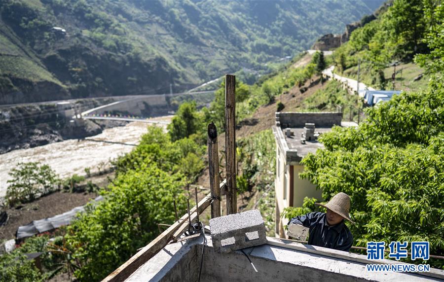 怒江傈僳族自治州福贡县匹河乡托坪村脱贫户普四三在盖新房,不远处江面上是去年通车的托坪大桥(4月15日摄) 。 新华社记者 江文耀 摄