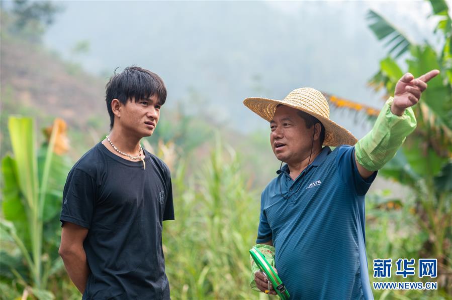 在云南省西双版纳傣族自治州勐海县布朗山布朗族乡曼囡村曼班三队,扶贫工作组长罗志华(右)在指导村民扎培种植技术(4月10日摄)。新华社记者 胡超 摄
