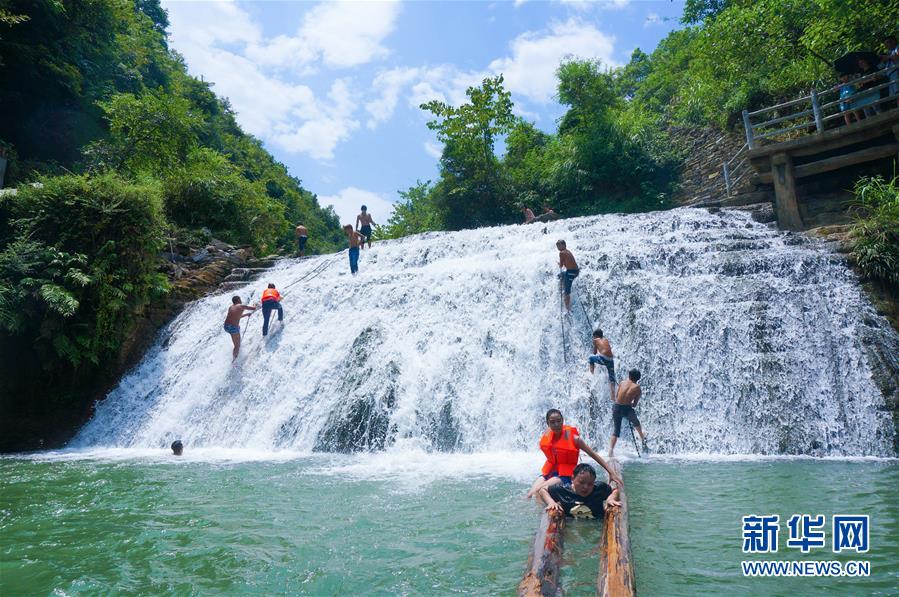 游客在凤凰县菖蒲塘村飞水谷景区瀑布游玩。摄于2014年8月。新华社发