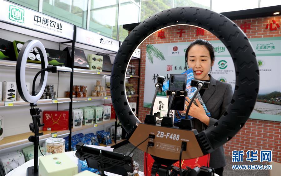 2020年4月21日,在金米村培训中心,秦岭天下电子商务有限公司员工李旭瑛在网上直播卖木耳。 陕西省商洛市柞水县小岭镇金米村是传统的山区农业村,为拓宽贫困群众的增收渠道,金米村将木耳产业作为脱贫攻坚主导产业,引进5家农业龙头企业,建成木耳菌包生产厂和木耳分拣包装生产线,并推行“借袋还耳”“借棚还耳”木耳产业发展新模式,带动全村188户贫困户参与木耳产业发展。 (新华社记者 梁爱平 摄)