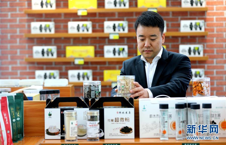 2020年4月21日,秦岭天下电子商务有限公司总经理赵少康在金米村培训中心整理货架。 陕西省商洛市柞水县小岭镇金米村是传统的山区农业村,为拓宽贫困群众的增收渠道,金米村将木耳产业作为脱贫攻坚主导产业,引进5家农业龙头企业,建成木耳菌包生产厂和木耳分拣包装生产线,并推行“借袋还耳”“借棚还耳”木耳产业发展新模式,带动全村188户贫困户参与木耳产业发展。 (新华社记者 梁爱平 摄)