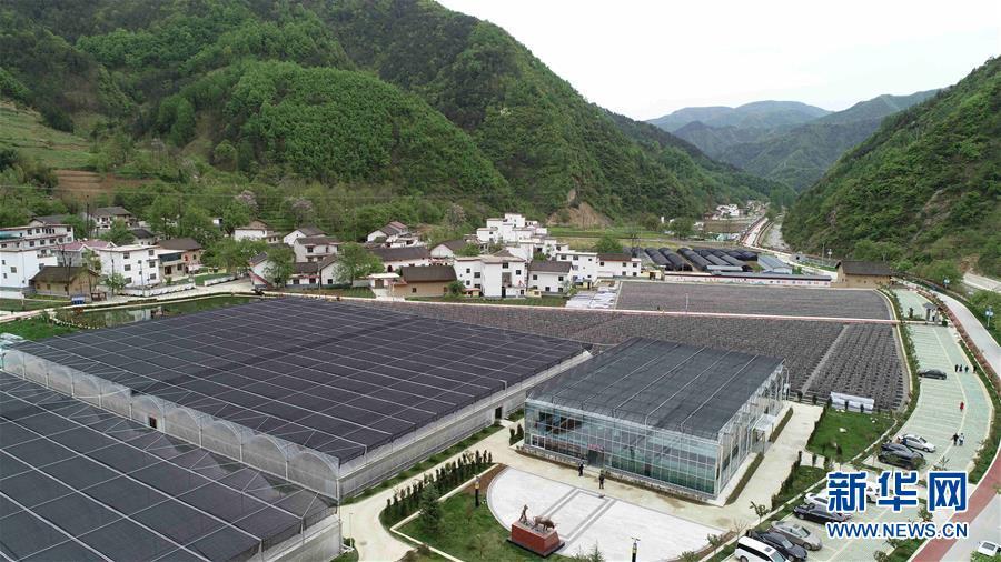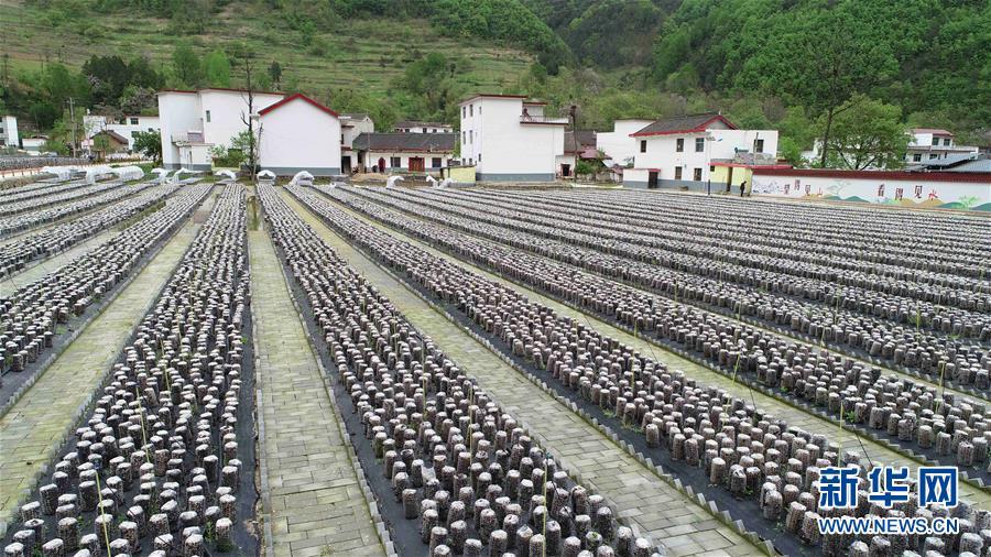 这是2020年4月21日拍摄的金米村棚栽木耳产业园(无人机照片)。 陕西省商洛市柞水县小岭镇金米村是传统的山区农业村,为拓宽贫困群众的增收渠道,金米村将木耳产业作为脱贫攻坚主导产业,引进5家农业龙头企业,建成木耳菌包生产厂和木耳分拣包装生产线,并推行“借袋还耳”“借棚还耳”木耳产业发展新模式,带动全村188户贫困户参与木耳产业发展。 (新华社记者 陈昌奇 摄)