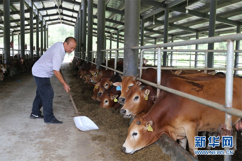 水北村驻村第一书记王正杰在慧牛养殖基地查看牛的长势。新华网 张瑜 摄
