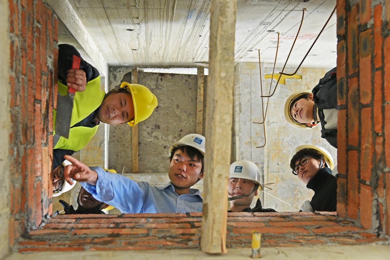 邹彬(右四)在和工友探讨砌墙技术。 受访者供图