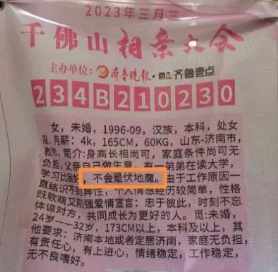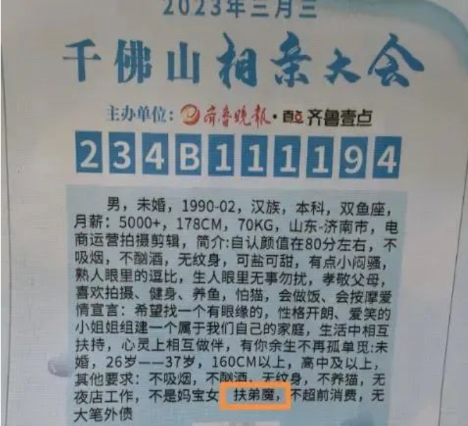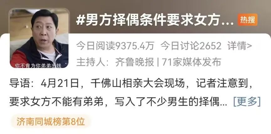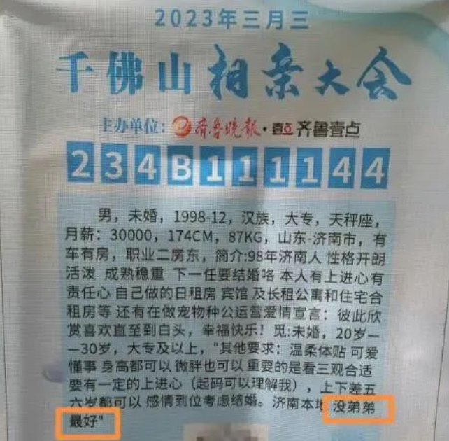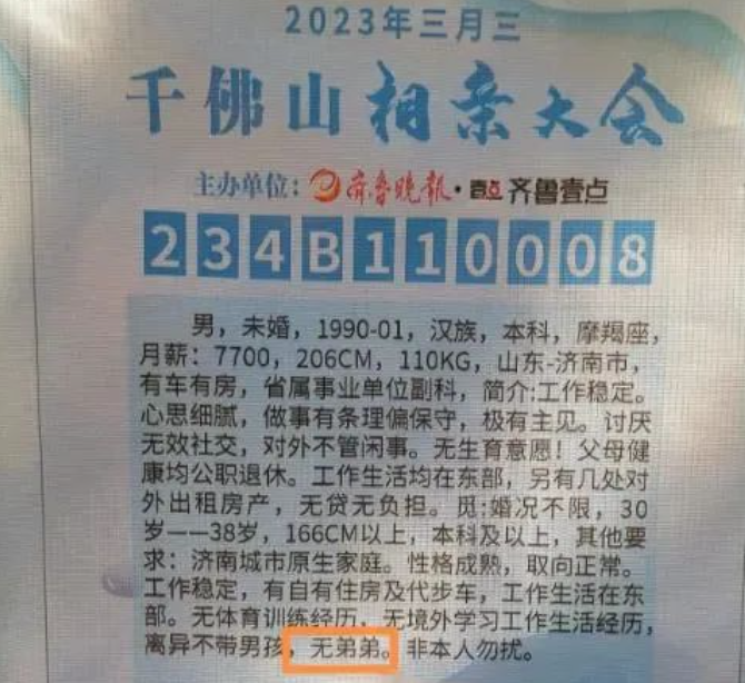 据齐鲁晚报报道,4月21日,山东济南千佛山相亲大会现场,要求女方不能有弟弟,写入了不少男生的择偶条件。