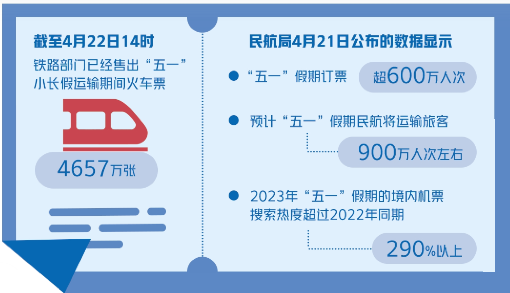 记者从中国国家铁路集团有限公司了解到,截至4月22日14时,铁路部门已经售出“五一”小长假运输期间火车票4657万张。铁路部门表示,将采取多种措施,进一步加大运力投放,努力满足旅客出行需求。4月27日至5月4日假日运输期间,全国铁路安排日均开行旅客列车将达到10500余列,增开旅客列车1500多列。机票方面也出现了同样火爆的情况。从民航局4月21日公布的数据来看,“五一”假期订票超600万人次,旅客出行需求提前释放,预计“五一”假期民航将运输旅客900万人次左右。携程数据显示,2023年“五一”假期的境内机票搜索热度超过2022年同期290%以上,恢复至2019年同期的110%。