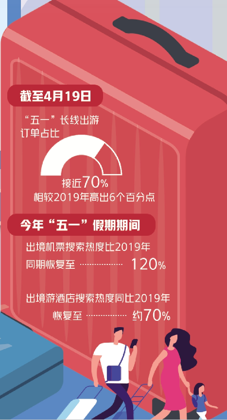 飞猪数据显示,截至目前,国内机票、酒店、景区门票、跟团游订单均已超过2019年同期,累计预订量同比去年大增超10倍,长线旅游成为今年“五一”假期游客首选,中长线游订单占比高达九成以上。去哪儿网数据显示,截至4月19日,“五一”长线出游订单占比接近70%,相较2019年高出6个百分点,长假出远门的热情更甚2019年之前。同时,长线旅行迅猛复苏也为国内景区带来利好,“五一”假期期间景区门票预订量较2019年增长超3倍。伴随着中长线旅游订单的增长,部分热门城市的机票、火车票也出现了“一票难求”的情况。美团数据显示,4月14日火车票订单量已达今年春运峰值的2倍,“五一”假期前两日已有多条热门线路高铁票售罄,部分线路车票甚至出现秒光的情况。