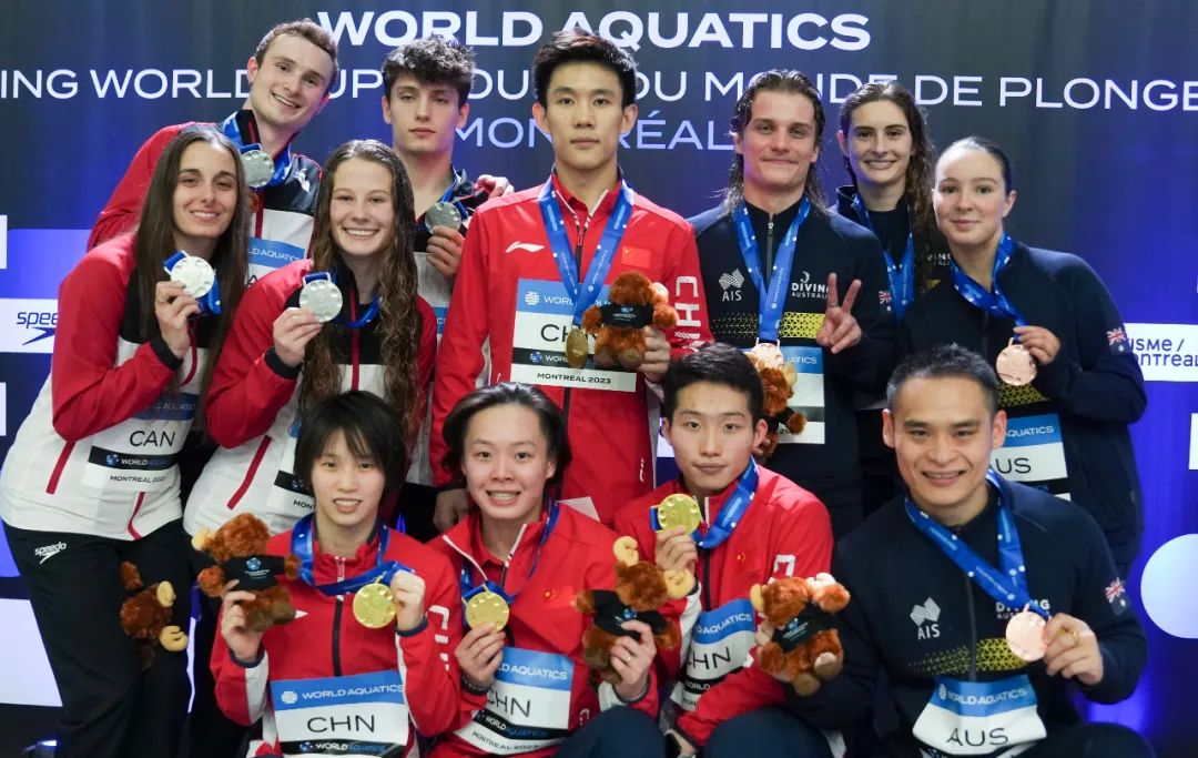北京时间5月8日,跳水世界杯蒙特利尔站决出了最后4个项目的金牌,中国队将这4枚金牌收入囊中。继上一站世界杯西安站后,中国队再次包揽全部9个项目金牌,强势领跑。