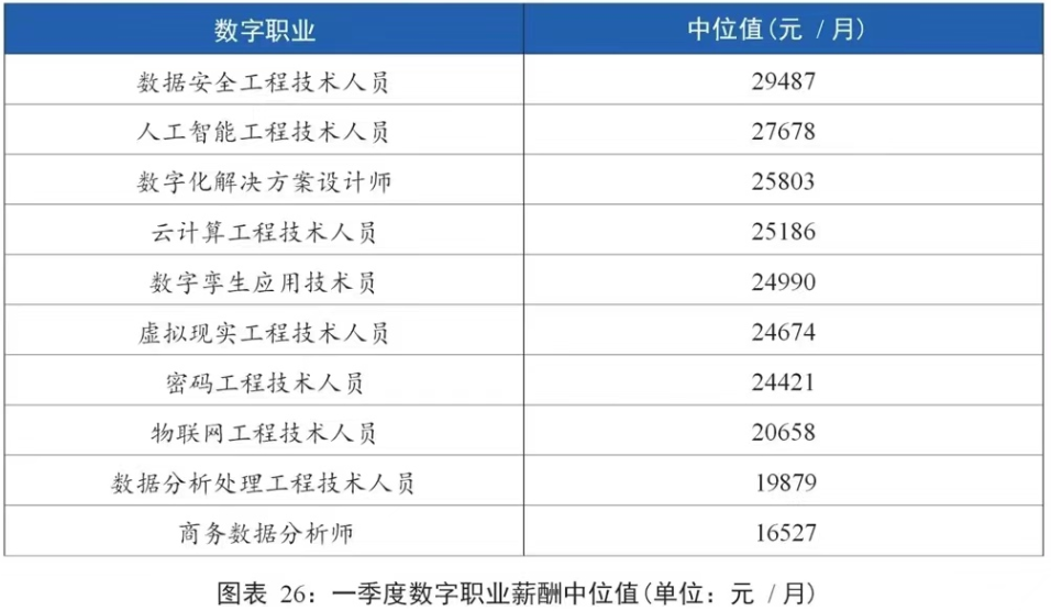 在本季度热度较高的10个数字经济职业中,8个职业的薪酬中位值高于20000元/月,其中数据安全工程技术人员、人工智能工程技术人员、数字化解决方案设计师、云计算工程技术人员等4个职业的薪酬中位值高于25000元/月。
