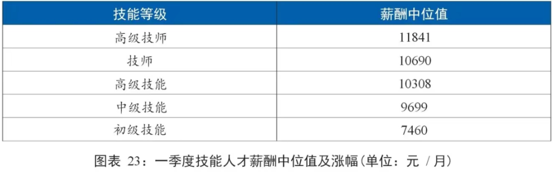 此外,随着企业生产经营活动趋于正常,一季度技能人才薪酬水平有所回升。高级技师、技师、高级技能人才月平均薪酬上四分位值*均超过12000元/月,月平均薪酬中位值均超过10000元/月。