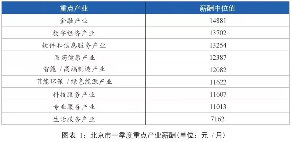 一季度,北京市稳经济政策效果持续显现,经济运行整体呈现企稳向好的态势。各类服务产业的薪酬水平环比增幅均高于5%,回升势头较为明显,其中专业服务产业及生活服务产业月平均薪酬中位值分别为11013元和7162元,环比增幅相对较为突出。