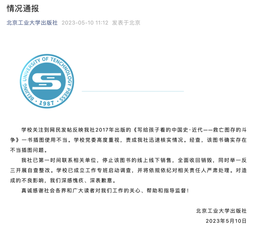 10日, “北京工业大学出版社”微信公号就网友反映《写给孩子看的中国史·近代——救亡图存的斗争》一书插图使用不当问题做出回应,全文如下: