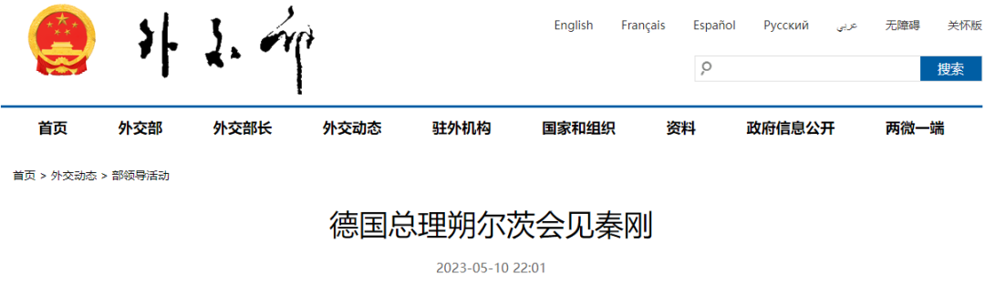 当地时间2023年5月10日,德国总理朔尔茨(右)在柏林会见国务委员兼外长秦刚。图源:外交部网站