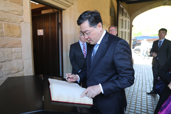 秦刚并在签名簿上留言:维护战后国际秩序、促进世界和平繁荣、实现中国国家统一。