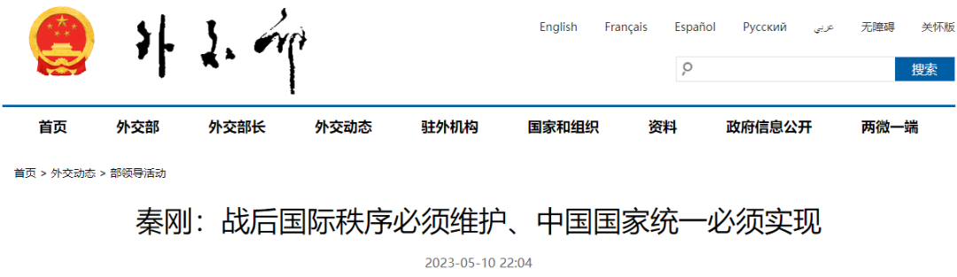 秦刚说,我们要牢记历史给我们的警示:战后国际秩序必须得到维护!国际公平正义必须得到伸张!搞“台独”分裂,挑战国际公理和秩序,逆历史潮流而动,注定是绝路一条。中国国家统一必须要实现!