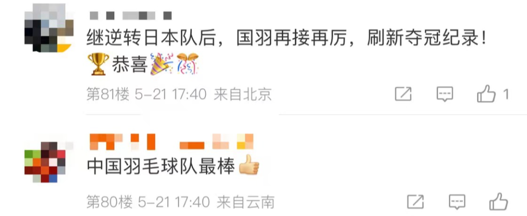 此前,在20日的半决赛中,国羽苦战五场,最终3:2逆转战胜日本队,挺进决赛,并于21日夺冠!