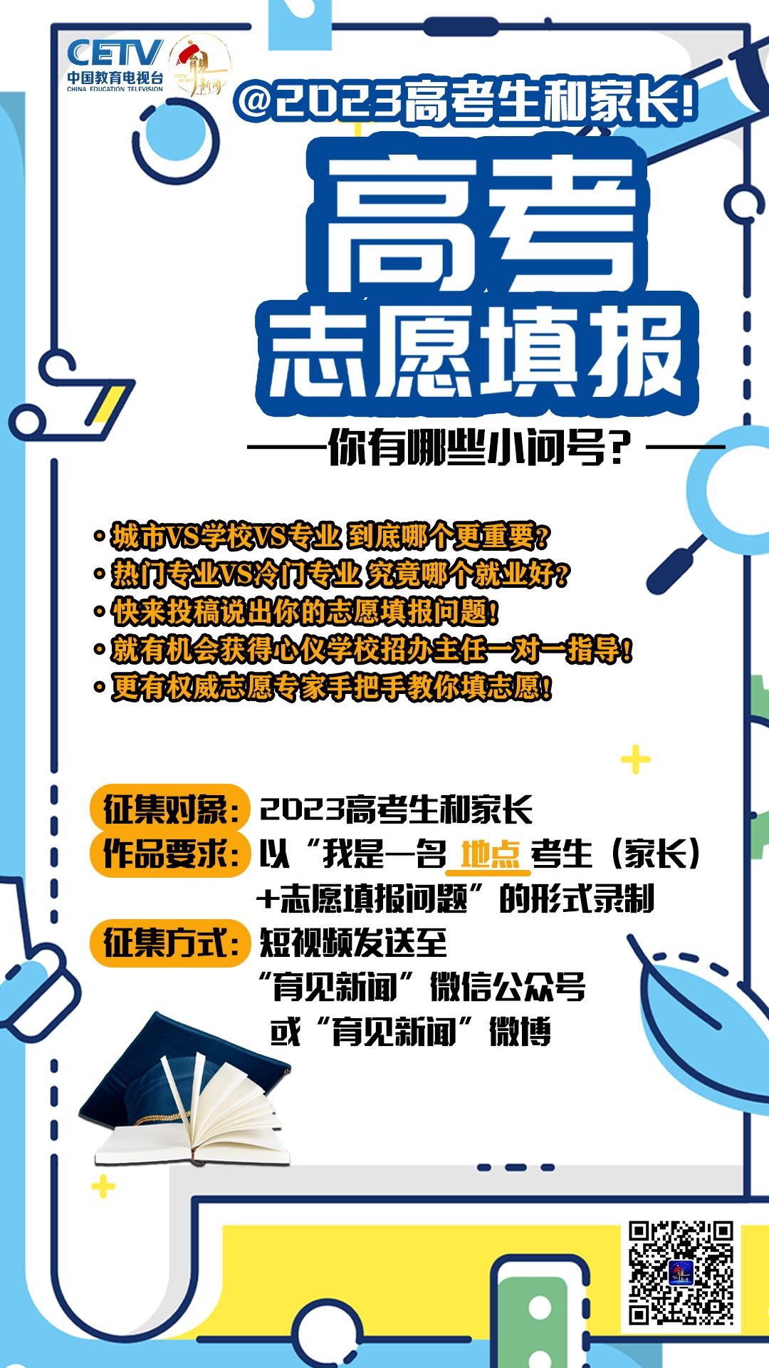 所有视频请以“2023高考志愿小问号投稿”命名,发送至“育见新闻”微信公众号或者“育见新闻”微博。