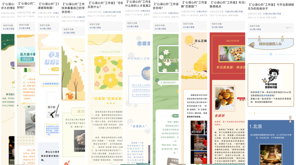 1. 传播心理科学,提升认知水平。工作室利用微信公众平台,根据同学们不同成长阶段推送心理健康教育主题,在“入学季”“成长季”“选择季”“毕业季”,重点推出专题推送,将心理健康教育贯穿学生成长全过程。同时,每周收集学生热点心理话题或困惑,长期邀请心理咨询中心为专家顾问,制作为原创科普系列,至今已推送35期内容。