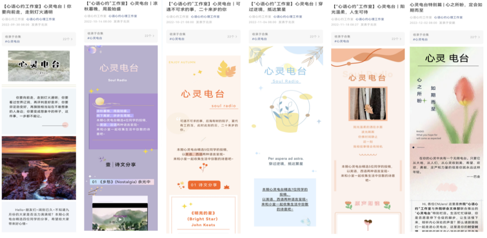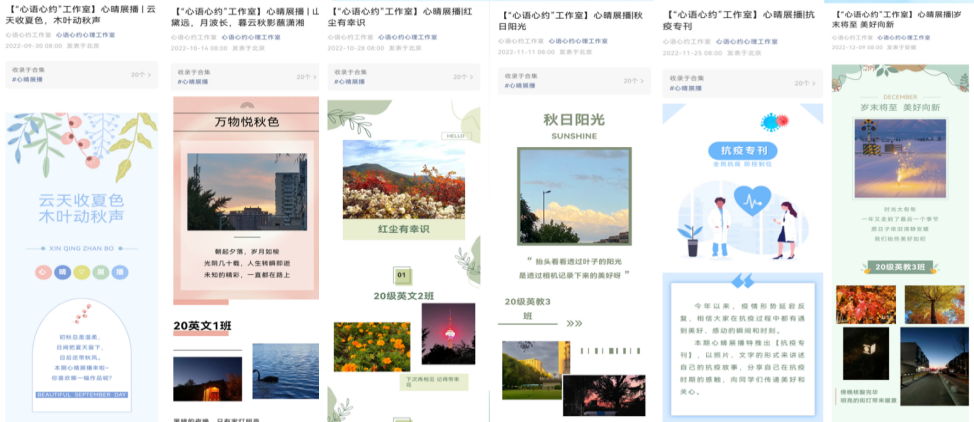 2. 融合专业特色,美育滋养心灵。工作室将语言专业与艺术滋养相结合,尤其着重发挥文化氛围对学生潜移默化的影响,给予学生美好的精神享受和第二课堂的发展空间。推送心晴展播甄选生活日常投稿,将中外文文案与图片结合,引导学生更加热爱生活,关心他人。“心灵电台”组织收集多语种诗词朗诵、歌曲演唱音视频,视听结合,“以美育人、以文化人”。