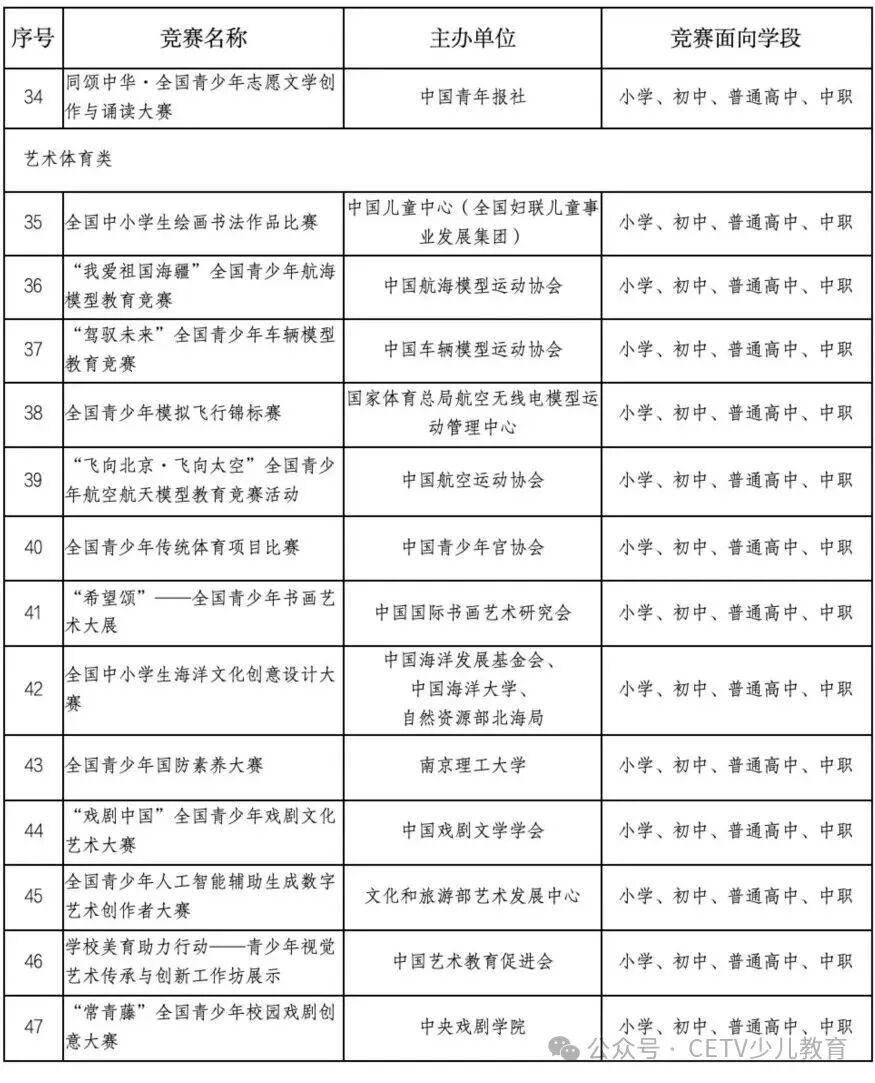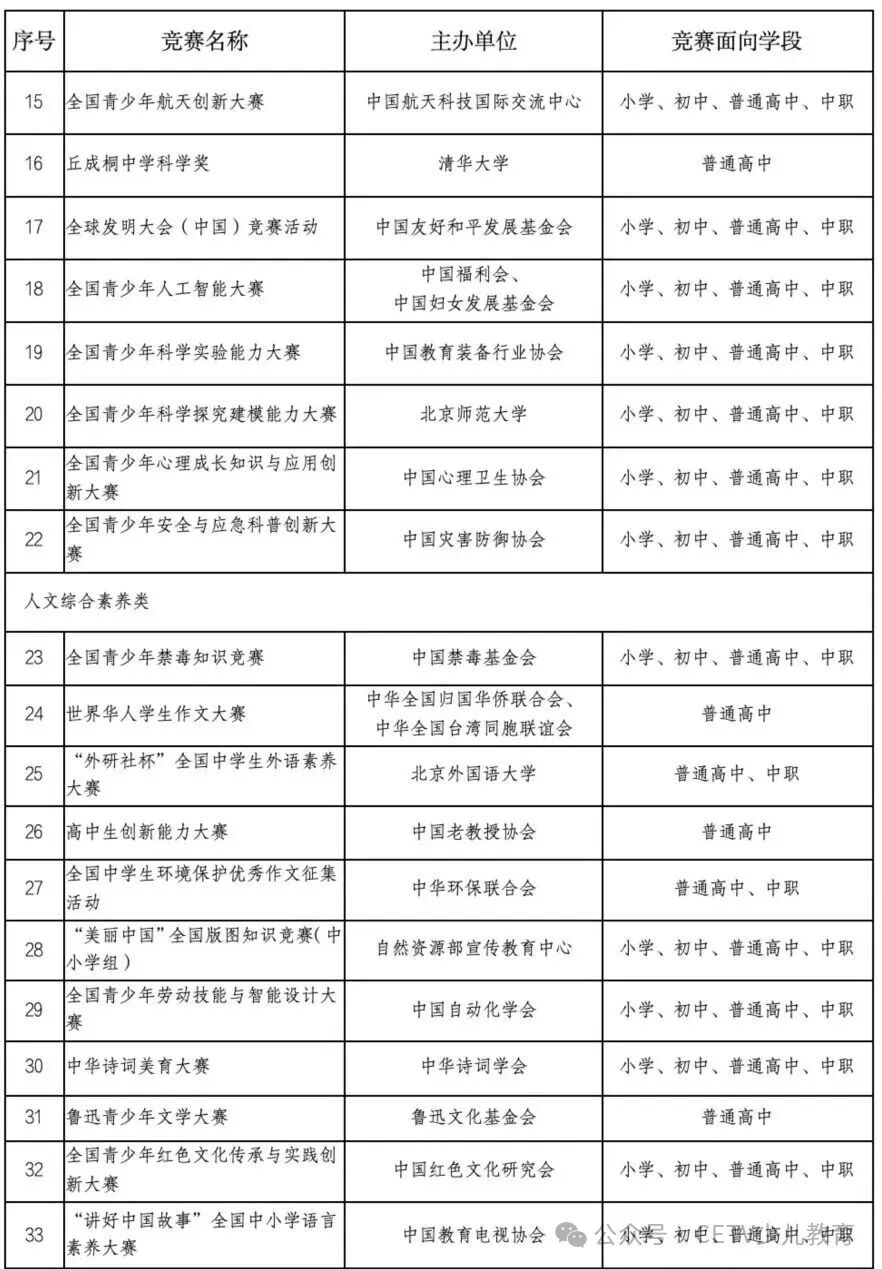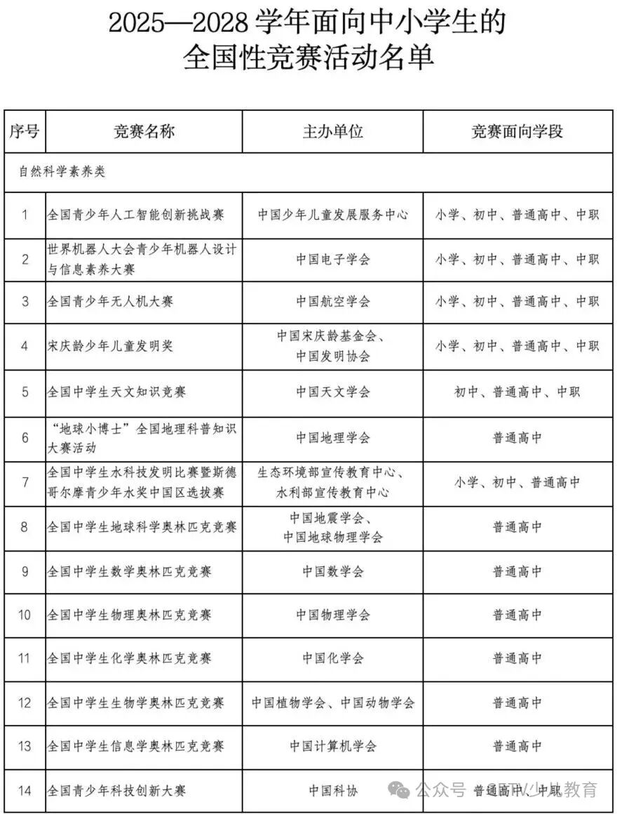 日前,教育部公布了《2025—2028学年面向中小学生的全国性竞赛活动名单》(俗称“白名单”),共有“全国青少年人工智能创新挑战赛”等47项竞赛进入名单。