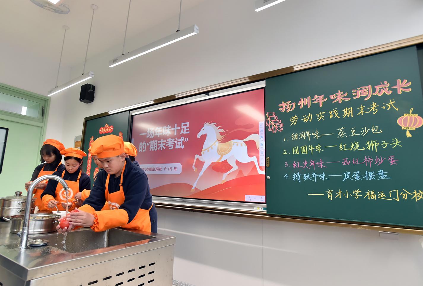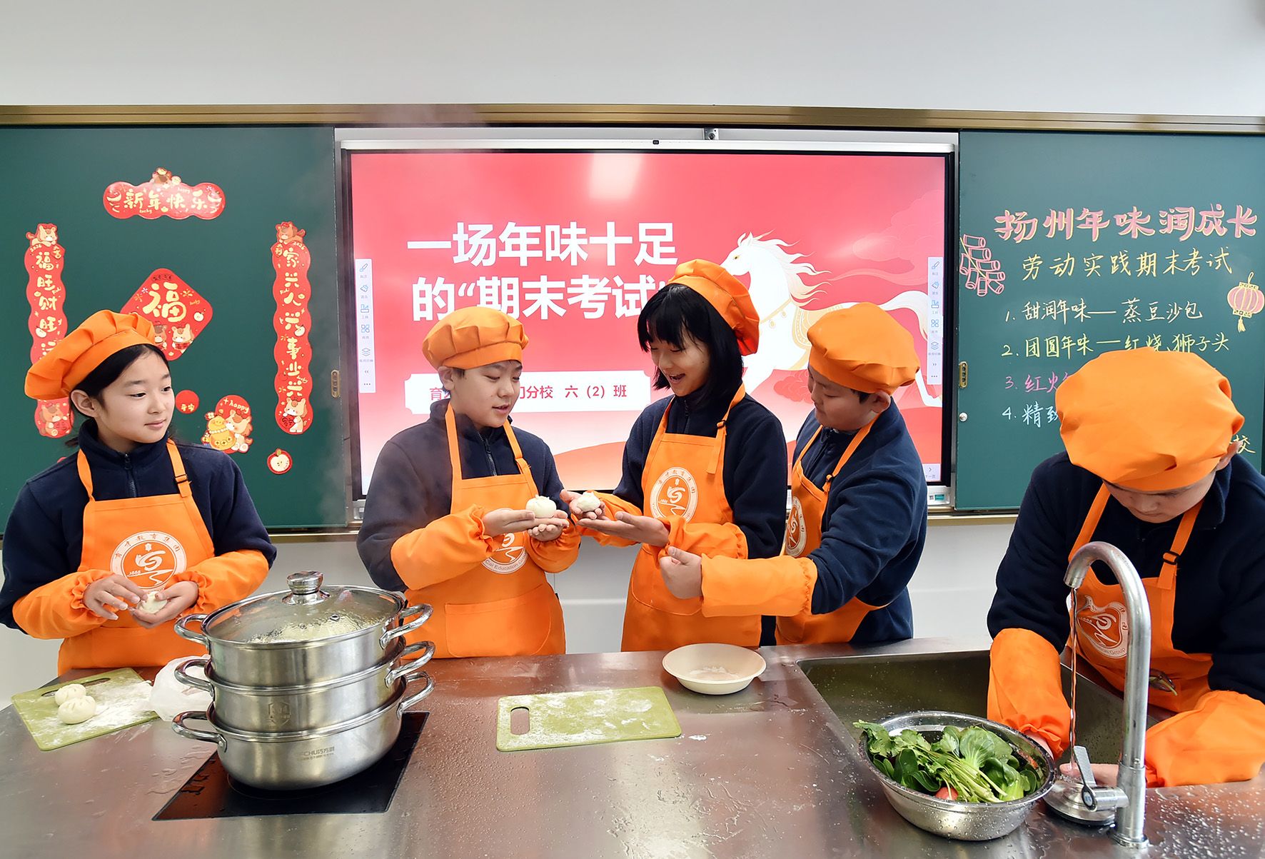 “这场期末考试太有意义了!我们不仅学会了做四道扬州特色菜,还了解了很多年俗文化,感受到了劳动的快乐。”六年级小学生王璐扬拿着自己的劳动成果兴奋地说。
