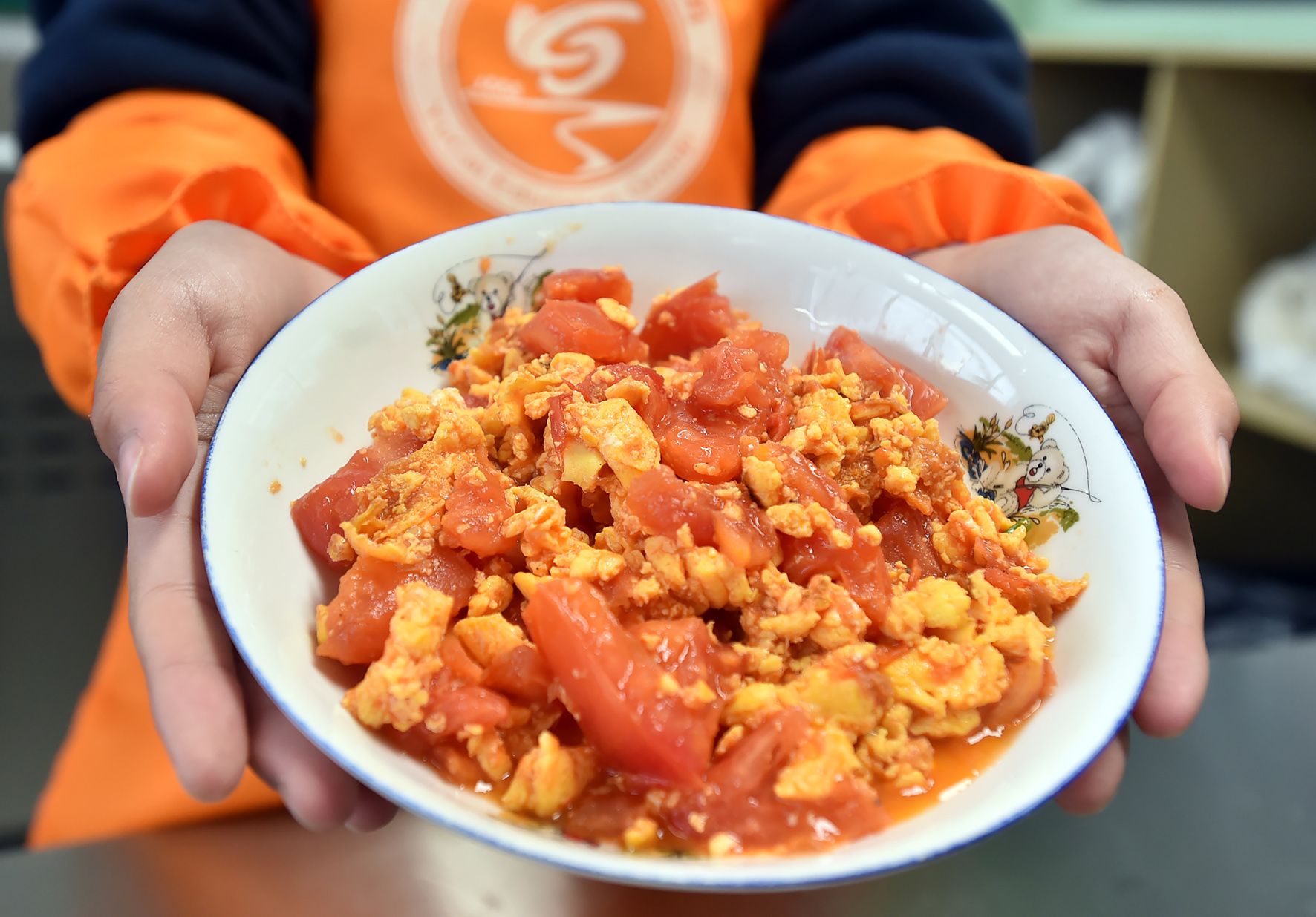 图为,小学生展示自己烹饪的西红柿炒鸡蛋。