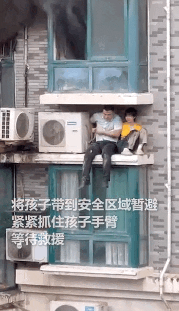 经过多次尝试许亮终于来到孩子身旁一把抱住女孩将其救下随后转移至平台上暂避等待消防救援