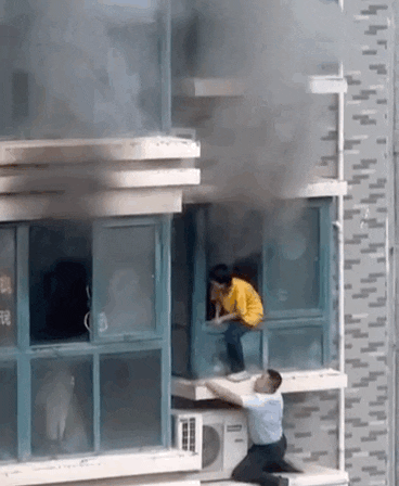 13日下午4时许山东济南一居民家意外起火火势迅猛一名女孩被困在卧室无助地跨坐在窗边大哭危急时刻邻居大哥许亮冒着生命危险在没有任何保护措施的条件下从窗户外徒手爬到2楼夹层处