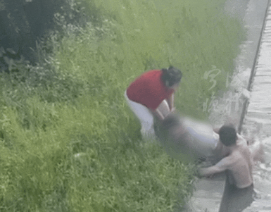 不到1分钟年轻人就把落水者带到岸边这时,岸上的一位阿姨也加入到救援中来使劲拉拽与刘庆广一起合力将落水男子成功救上了岸