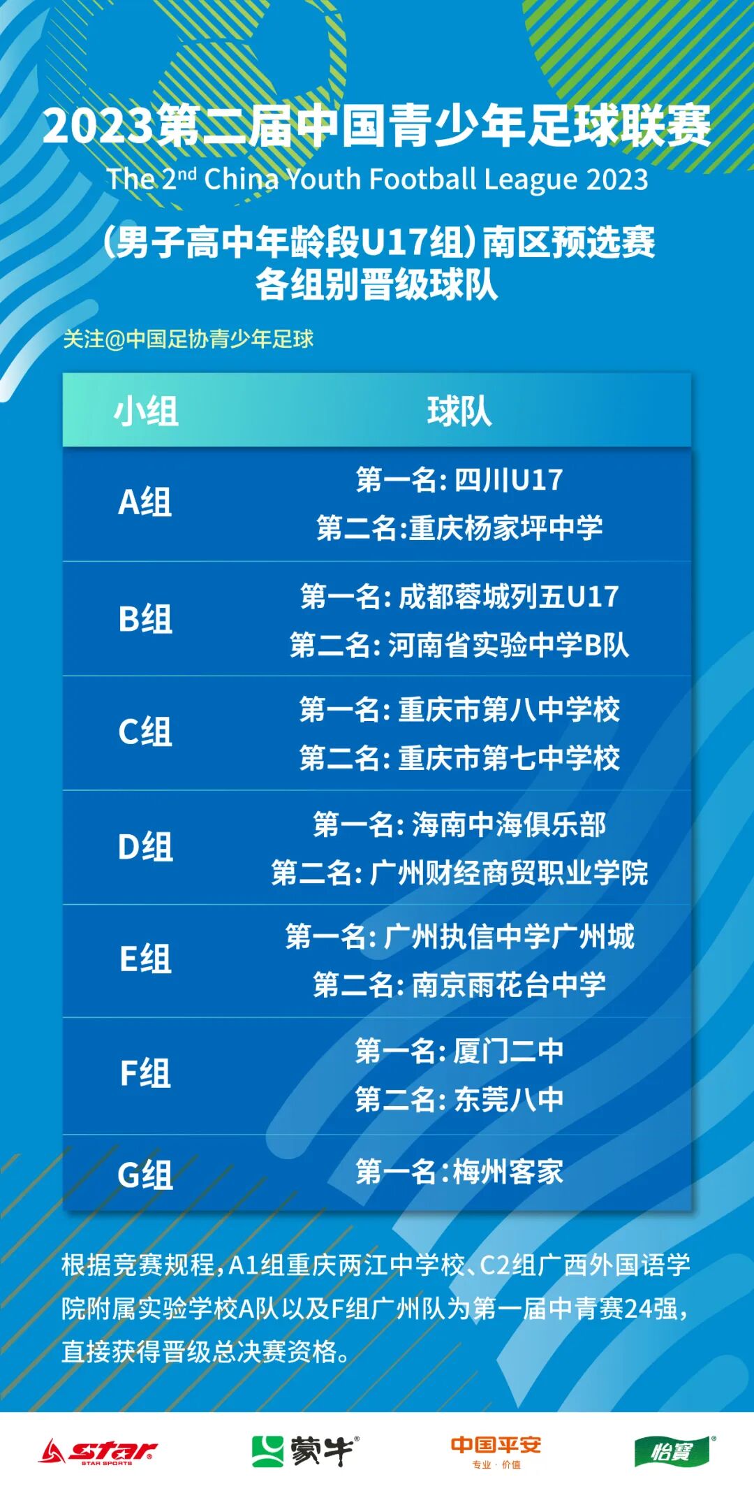 中国青少年足球联赛是由教育部、国家体育总局指导,中国足协主办的一项覆盖面最广、竞技水平最高、参与人数最多、社会影响力最大的青少年足球顶级赛事。