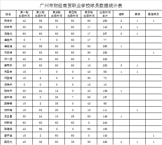 7天五轮比赛,4胜1负,20名球员均有上场机会,9人取得进球,总进球18个,苏清华、梁炫光、廖子运、马贺洋分别获得了最佳球员。以下是球员详细数据: