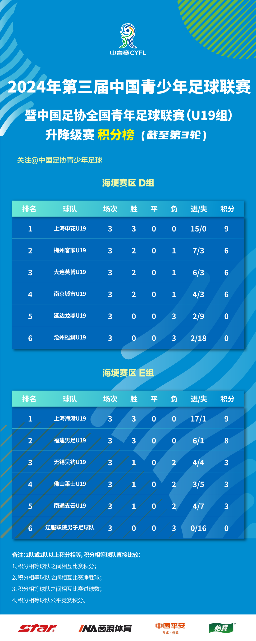 6月3日,2024年第三届中国青少年足球联赛暨中国足协全国青年足球联赛(U19组)第二阶段进行了第3轮比赛。