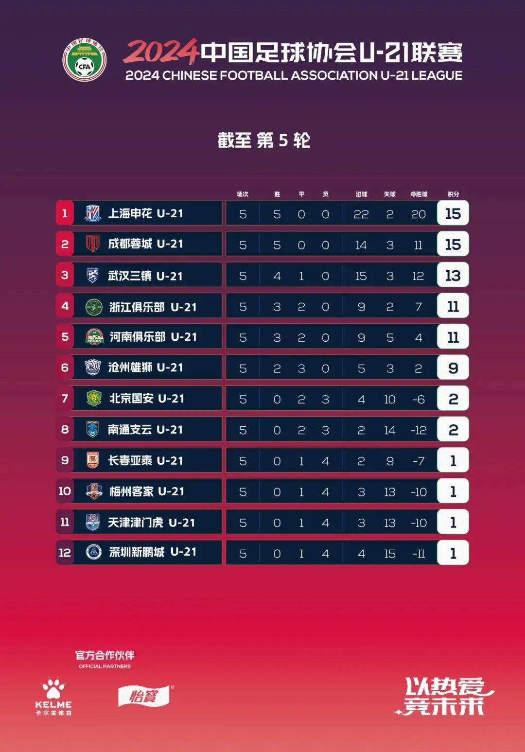 上海申花和成都蓉城各自延续全胜势头,同积15分,分列积分榜第一、二名。
