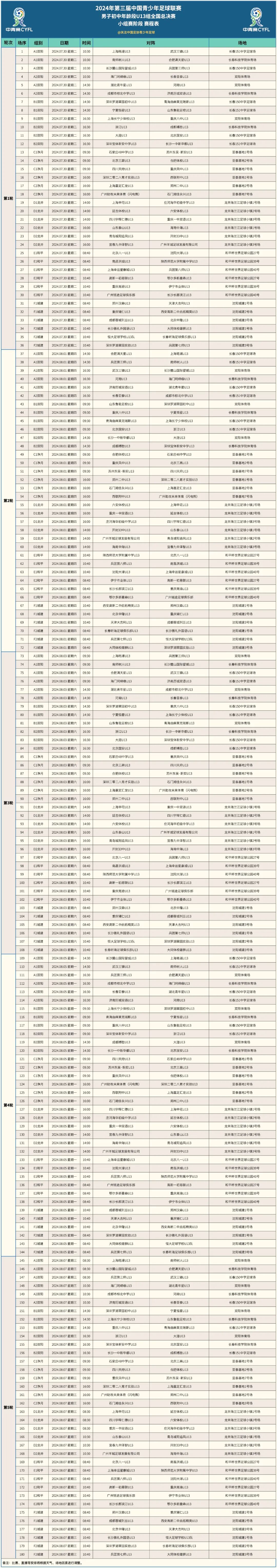 中国青少年足球联赛赛事办公室将于7月28日至8月10日组织第三届中国青少年足球联赛男子初中年龄段U13组全国总决赛小组赛阶段比赛,比赛将于7月30日正式开赛,72支球队将展开5轮、180场精彩对决。