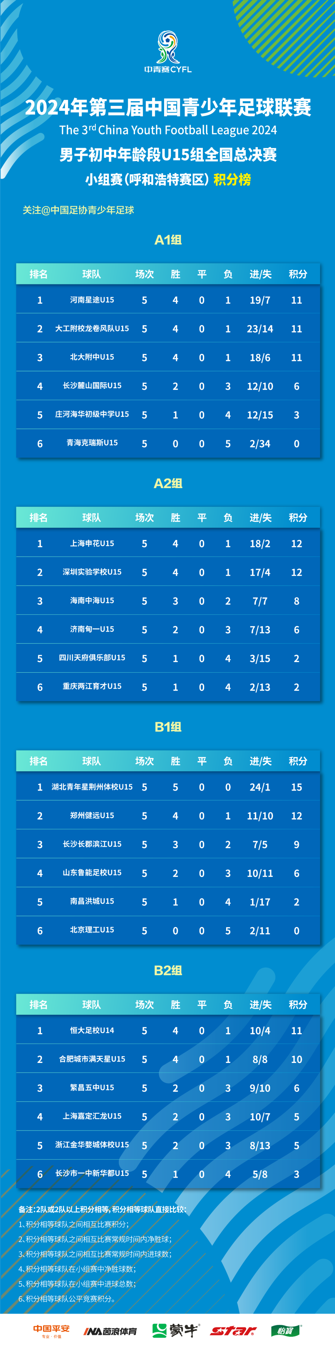 在A1组的比赛中,河南星途U15以7-0大胜青海克瑞斯U15,北大附中U15以2-3憾负于大工附校龙卷风队U15,河南星途U15、大工附校龙卷风队U15和北大附中U15三队均取得4胜1负积11分的战绩,河南星途U15和大工附校龙卷风队U15凭借相互间胜负关系和常规时间净胜球的优势以前两名晋级;长沙麓山国际U15以4-3战胜庄河海华初级中学U15。在A2组的比赛中,上海申花U15以3-2绝杀深圳实验学校U15,两队均取得4胜1负积12分的战绩,携手晋级;重庆两江育才U15在常规时间内1-1战平四川天府俱乐部U15,在点球大战中2-4遗憾失利;济南甸一U15以3-2战胜海南中海U15。