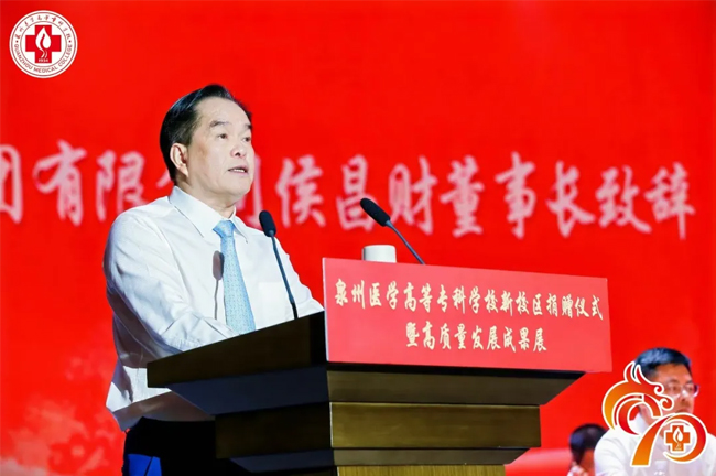 厦门源昌集团有限公司董事长侯昌财先生发表了热情洋溢的讲话。他说:把投资32亿元建成的泉州医高专南安新校区捐赠给泉州医学教育事业,是他奋斗一生的最大心血结晶之一,是他致力慈善公益事业的一次壮举,实现了他捐建从幼儿园到大学各阶段学校全覆盖的梦想和夙愿。源昌集团与泉州医高专的相遇,是善心与爱心的相遇,是善愿与善缘的相逢。光彩夺目的南安新校区,是慈善的光辉照耀下结出的善果。奉献爱心,造福一方,是他始终不变的价值追求。站在学校发展历史的重要节点上,医高专人应该有更大的格局,更高的追求;党委政府、学校及社会力量三方要同心同德,共谋共建。他表示,还会继续支持帮助学校快速发展,扩大校区面积,投入建设资金,为建成一所高水平的泉州医科大学而努力。他将把慈善公益精神、立大志做大事的精神、做什么成什么的精神三大精神财富留给学校,同时祝愿学校事业蒸蒸日上,桃李满天下、德泽惠苍生。