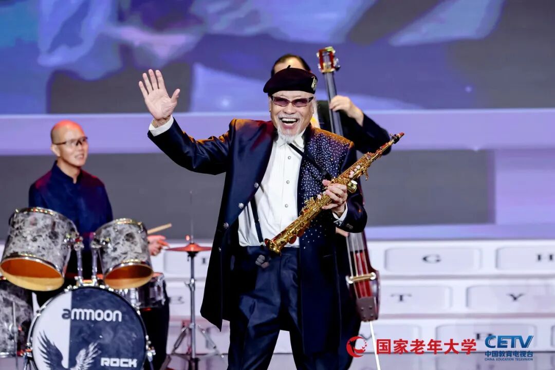 闭幕式高潮迭起,精彩纷呈。器乐组合《音韵流长》以“混搭”风惊艳全场。92岁高龄的萨克斯演奏家范圣琦领奏,“老树皮”爵士乐队与浙江衢州老年开放大学女子民乐队联袂演出,中西合璧、老少同台,演绎了《青春啊青春》《金梭银梭》等跨越时代的经典旋律,引发全场共鸣。著名诗人王怀让创作的《我骄傲,我是中国人》由朗诵赛道六位获奖者深情献声,国家语委教授姚喜双与中央广播电视总台主持人孙小梅担任领诵。他们以铿锵饱满的声音,抒发出对祖国的无限热爱与自豪,深深感染了现场每一位观众。随后,民族舞蹈秀《石榴籽花正红》绚丽登场,汇聚维吾尔族、蒙古族、朝鲜族、土家族和畲族等多民族舞蹈元素,中央民族大学舞蹈学院院长姜铁红与众多银龄舞者共同起舞,以动人舞姿展现中华民族团结一心、守望相助的深厚情谊。