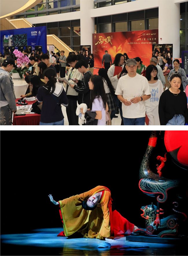 楚风舞韵动蓉城,视听盛宴引共鸣。10月8日晚的成都高新中演大剧院内人潮涌动、座无虚席。伴随着古朴而恢弘的音乐,舞剧《乐和长歌》缓缓拉开帷幕。来自湖北的舞者们以刚柔并济的舞蹈语汇,结合极具楚文化特色的乐器、服饰与舞美设计,交织出一幅浓郁的楚地礼乐画卷,生动演绎了浪漫瑰丽、神秘奇幻的楚式美学。现场观众沉浸在这场跨越千年的对话中,掌声随着剧情的推进此起彼伏。"这是一场让人震撼的楚文化视听盛宴!"一位来自成都的观众在演出结束后激动地表示,他认为舞蹈表演极具感染力,叙事表达富有层次,舞台意境深远悠长,是一部让人感动、值得回味的精品之作。