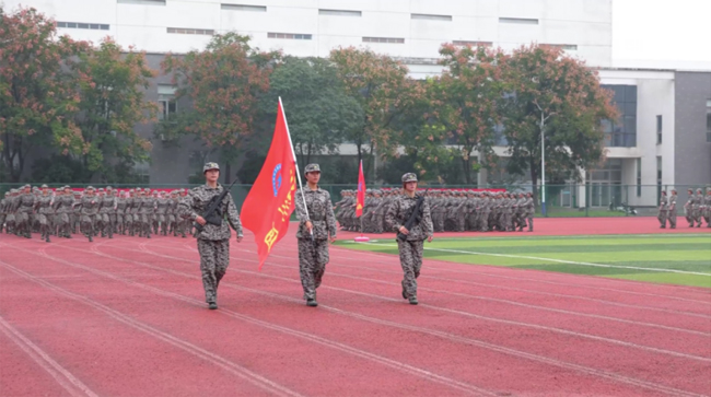 伴随着庄严的《中华人民共和国国歌》,五星红旗冉冉升起,全体人员肃立行注目礼,大会正式拉开帷幕。校党委书记王杰才、校长檀明在军训团负责人的陪同下,分别对两校区受训学生组成的方队进行检阅。