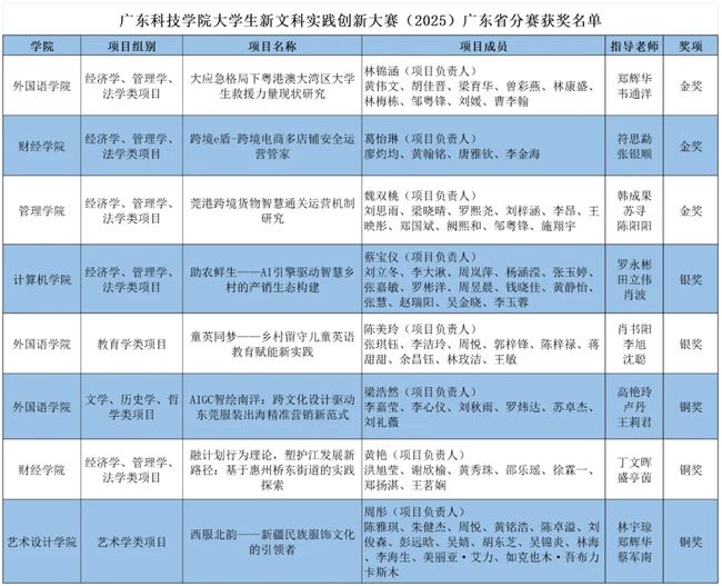 本届大赛由全国新文科教育研究中心主办,广东省省赛由广东省教育厅指导,华南农业大学负责承办。大赛吸引了中山大学、华南理工大学、暨南大学及深圳大学等43所高校的3700支队伍报名参赛,分文史哲、经管法、教育、艺术四个组别。自9月大赛启动以来,广东科技学院积极响应,全校师生踊跃参与,报名作品数量高达1418项,参赛人次5487人,充分展现了学校对此次大赛的高度重视以及师生们浓厚的参赛热情。历经多轮激烈角逐,学校最终有8个项目成功晋级省赛决赛。