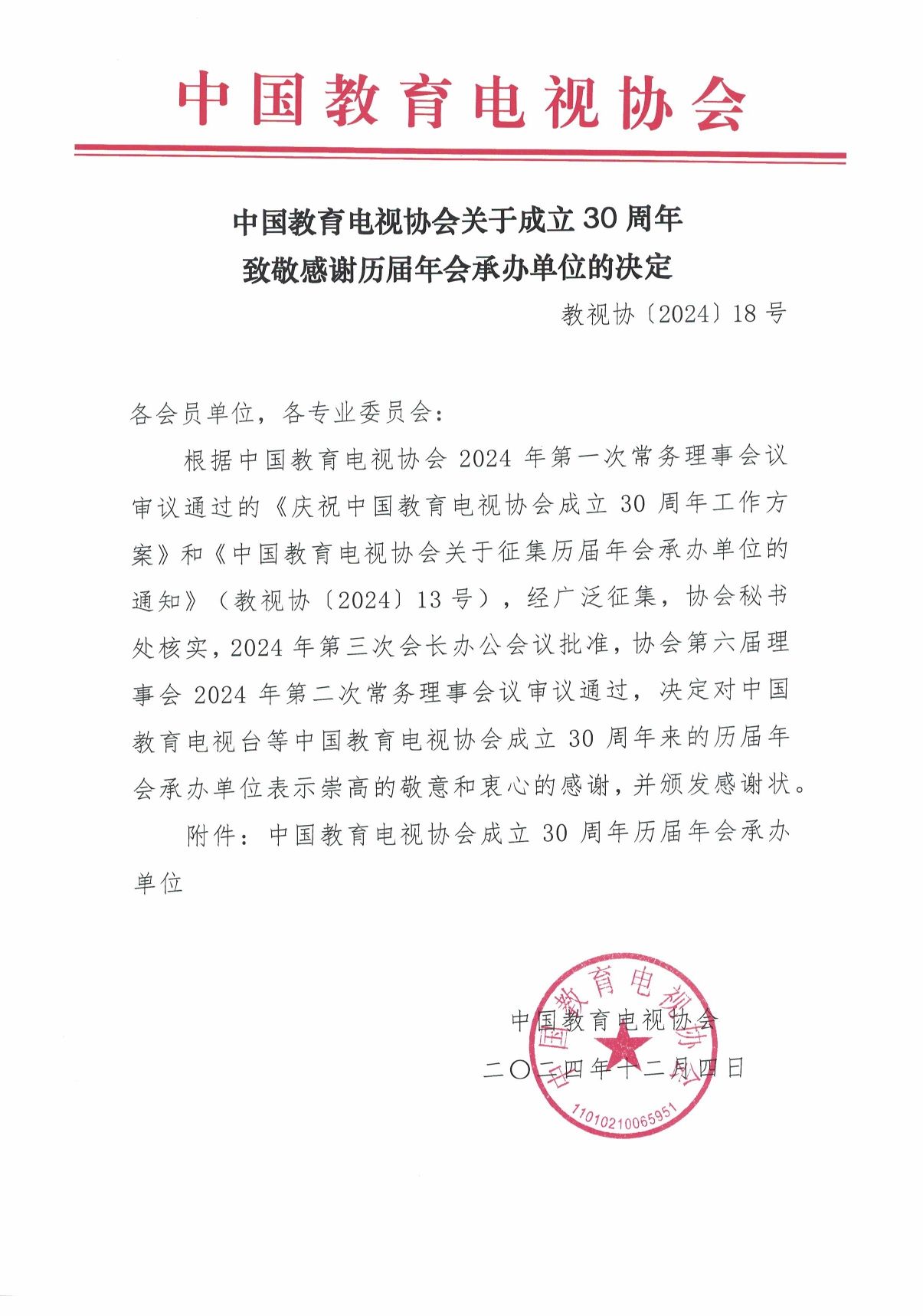 2024-18号,中国教育电视协会关于成立30周年致敬感谢历届年会承办单位的决定_page-0002
