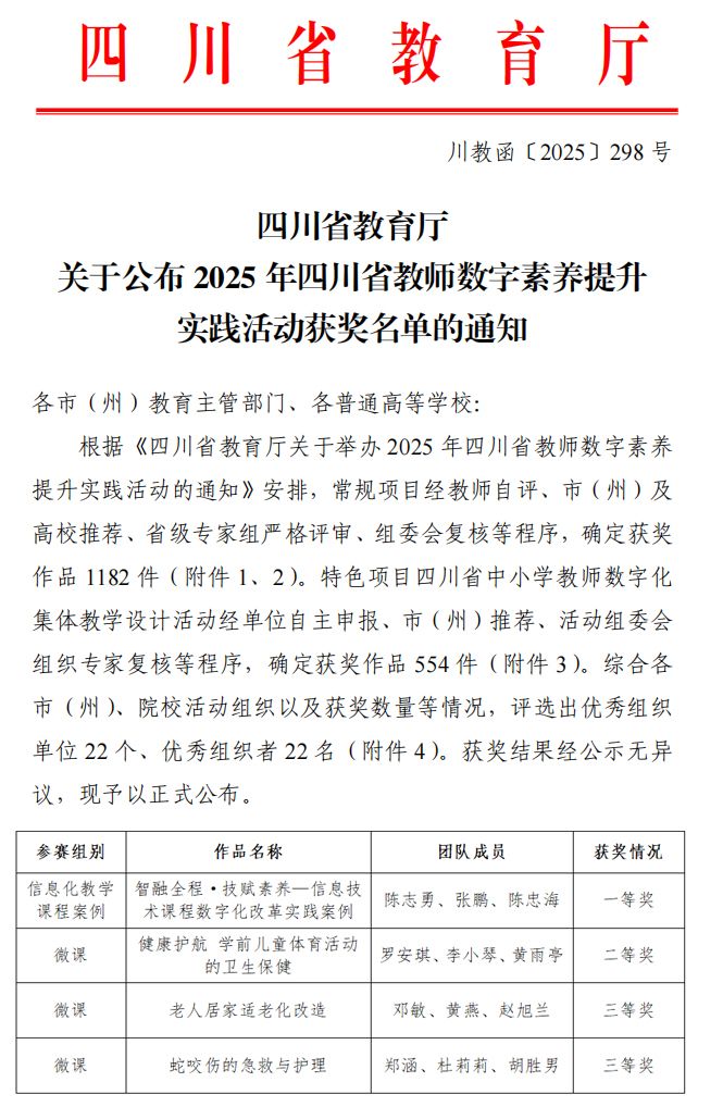 日前,四川省教育厅公布了2025年四川省教师数字素养提升实践活动-常规项目的获奖情况。四川三河职业学院在此项活动中表现卓越,荣获一等奖1项、二等奖1项、三等奖2项(本专科院校通评),并被推荐参加2025年全国师生信息素养提升实践活动。