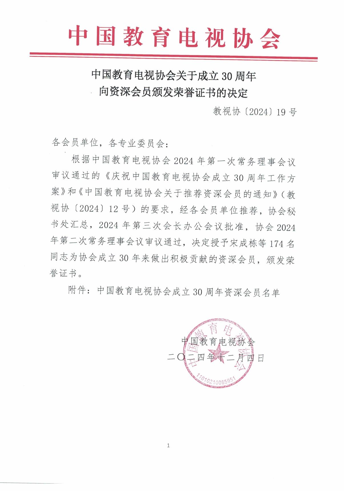 中国教育电视协会关于成立30周年向资深会员颁发荣誉证书的决定