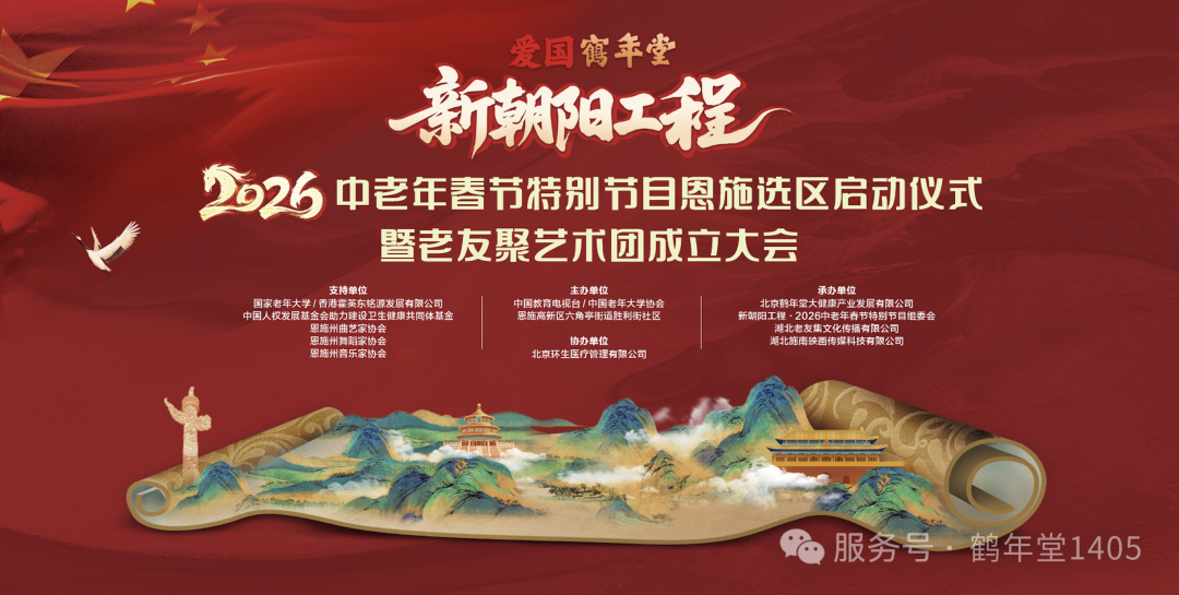 2025年10月11日,“新朝阳工程・2026中老年春节特别节目”恩施选区的启动仪式及老友聚艺术团的成立大会,在恩施市老友集文娱活动中心隆重开幕。本次活动由中国教育电视台与中国老年大学协会联合主办,国家老年大学、霍英东铭源发展有限公司、中国人权发展基金会助力建设卫生健康共同体基金提供支持,北京鹤年堂大健康产业发展有限公司与“新朝阳工程・2026中老年春节特别节目”组委会共同承办。