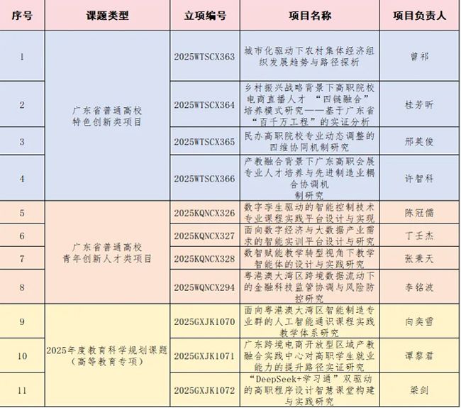 在本年度立项中,广东酒店管理职业技术学院共获批“广东省普通高校认定类科研项目”8项。其中,包括特色创新类项目4项,涵盖了乡村振兴、集体经济、电商直播人才培养、专业动态调整机制、产教融合与会展人才培养等前沿领域;以及青年创新人才类项目4项,研究内容聚焦数字孪生、数字经济、人工智能教学、金融科技监管等新兴技术方向,展现了学校青年教师队伍的创新潜力与应用研究能力。