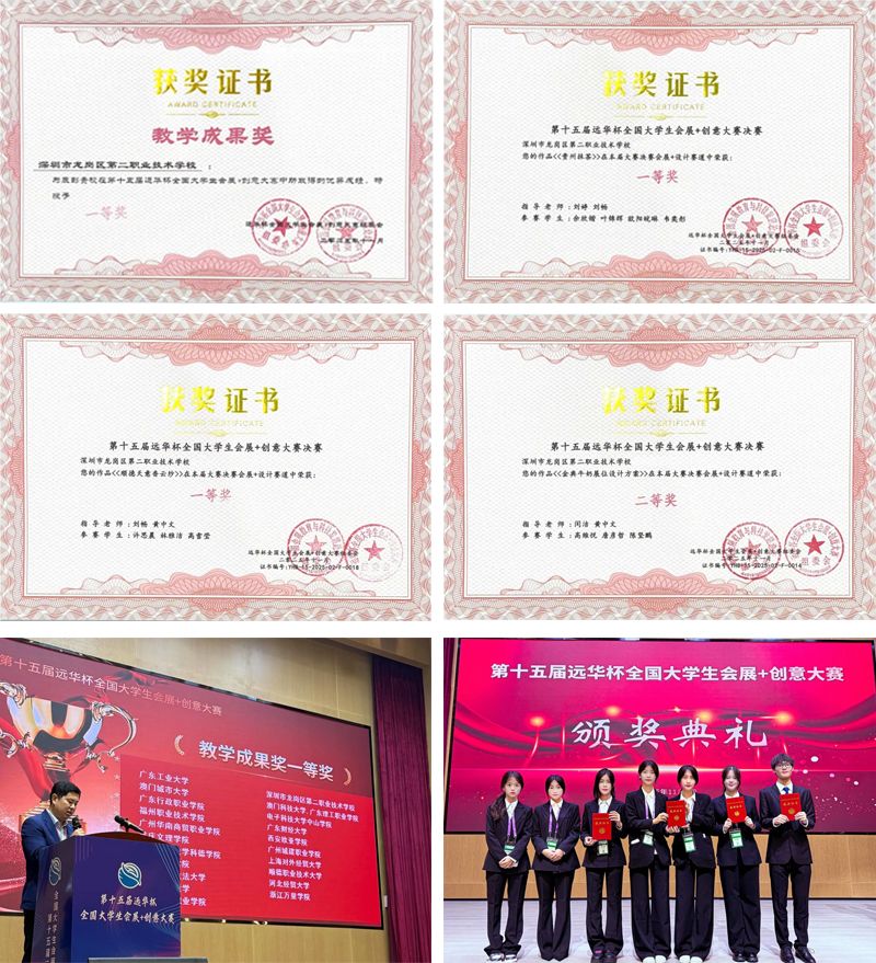 2025年11月7日-9日,第十五届“远华杯”全国大学生会展+创意大赛总决赛在广东清远广东工程职业技术学院(清远校区)成功举办。在这个代表国内会展教育高水平的竞技舞台上,深圳市龙岗区第二职业技术学校会展服务与管理专业有三支参赛队伍晋级总决赛,他们以中职学子身份对决来自全国各地的大学参赛选手,最终凭借扎实的专业功底、敏锐的创新思维和出色的现场表现能力,在激烈的竞争中脱颖而出,赢得了2个一等奖、1个二等奖的好成绩,同时学校会展专业也荣获教学成果一等奖,充分展现了新时代职业教育的蓬勃生机与亮丽风采。