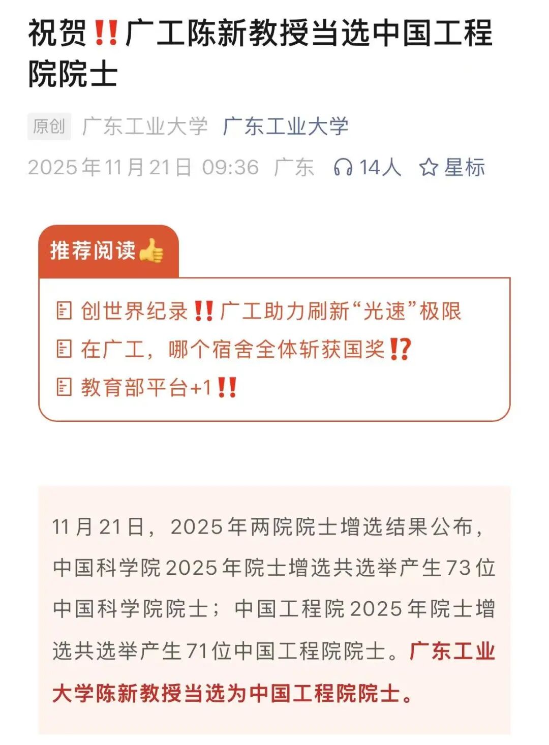 11月21日,2025年两院院士增选结果正式揭晓,共有144人当选。其中,共选举产生中国科学院院士73人,选举产生中国工程院院士71人。