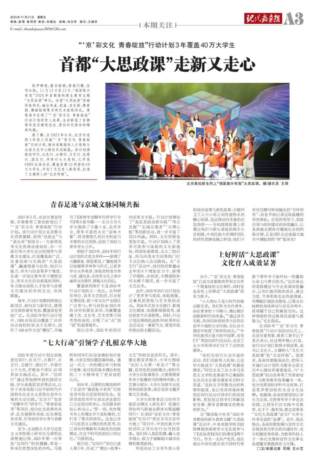 如今,“‘京’彩文化 青春绽放”已成为首都教育界和文化界一个现象级的文化事件,同时也是各校上好鲜活“大思政课”的有力抓手。