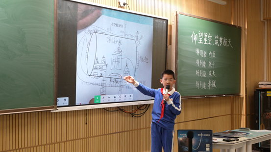 方寸教室汇星河,奇思妙想筑天宫。第三节课《仰望星空》在肖宇珊老师的带领下完美收官,却为孩子们打开了更广阔的梦想天地。分组而坐的学子们,带着前两节课的积累,在航天视频的震撼视听中回顾征程,在阅读材料的字里行间内化精神。随后,“小小航天工程师”的任务正式启动:设计航天员生活区!孩子们拿起画笔,大胆畅想——有人画上枝繁叶茂的大树净化舱内空气,让太空家园满是生机;有人精心划分健身区与娱乐区,保障航天员身心健康;还有人在外围设计了灵活的机械臂、高效的太阳能发电板,甚至配备了发射器与火炮口守护空间站安全……每一笔线条都承载着对未来的期许,每一个创意都彰显着航天精神的传承与对航天员的贴心关怀。当作品展示时,孩子们用稚嫩的语言阐述设计理念,让航天精神转化为敢于探索、勇于创新的实际行动。
